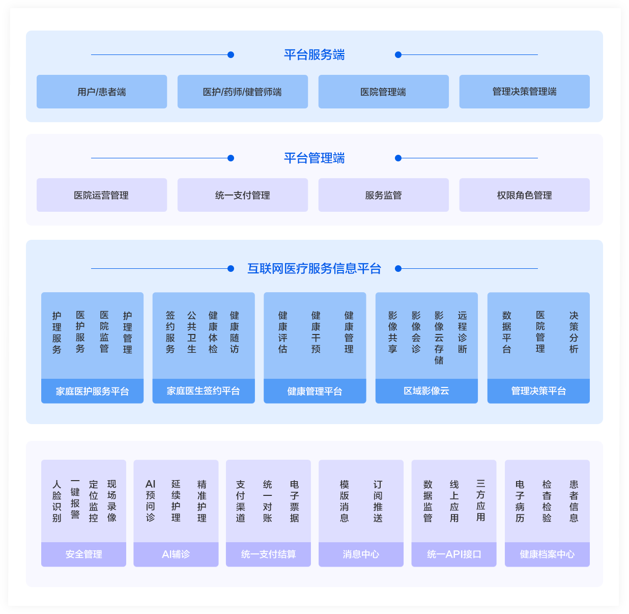 互聯(lián)網(wǎng)醫(yī)療服務(wù)信息平臺(tái),主要是面向醫(yī)療集團(tuán)和衛(wèi)健委建立統(tǒng)一的互聯(lián)網(wǎng)醫(yī)療與健康管理服務(wù)門戶,集中展示集團(tuán)或地區(qū)的優(yōu)質(zhì)醫(yī)療資源,為患者提供統(tǒng)一入口和統(tǒng)一平臺(tái),開展醫(yī)療服務(wù)、健康咨詢、慢病管理及醫(yī)療協(xié)同等相關(guān)業(yè)務(wù),并支持與集團(tuán)(區(qū)域內(nèi))醫(yī)院線下醫(yī)療服務(wù)的貫通,實(shí)現(xiàn)線上線下一體化服務(wù)。