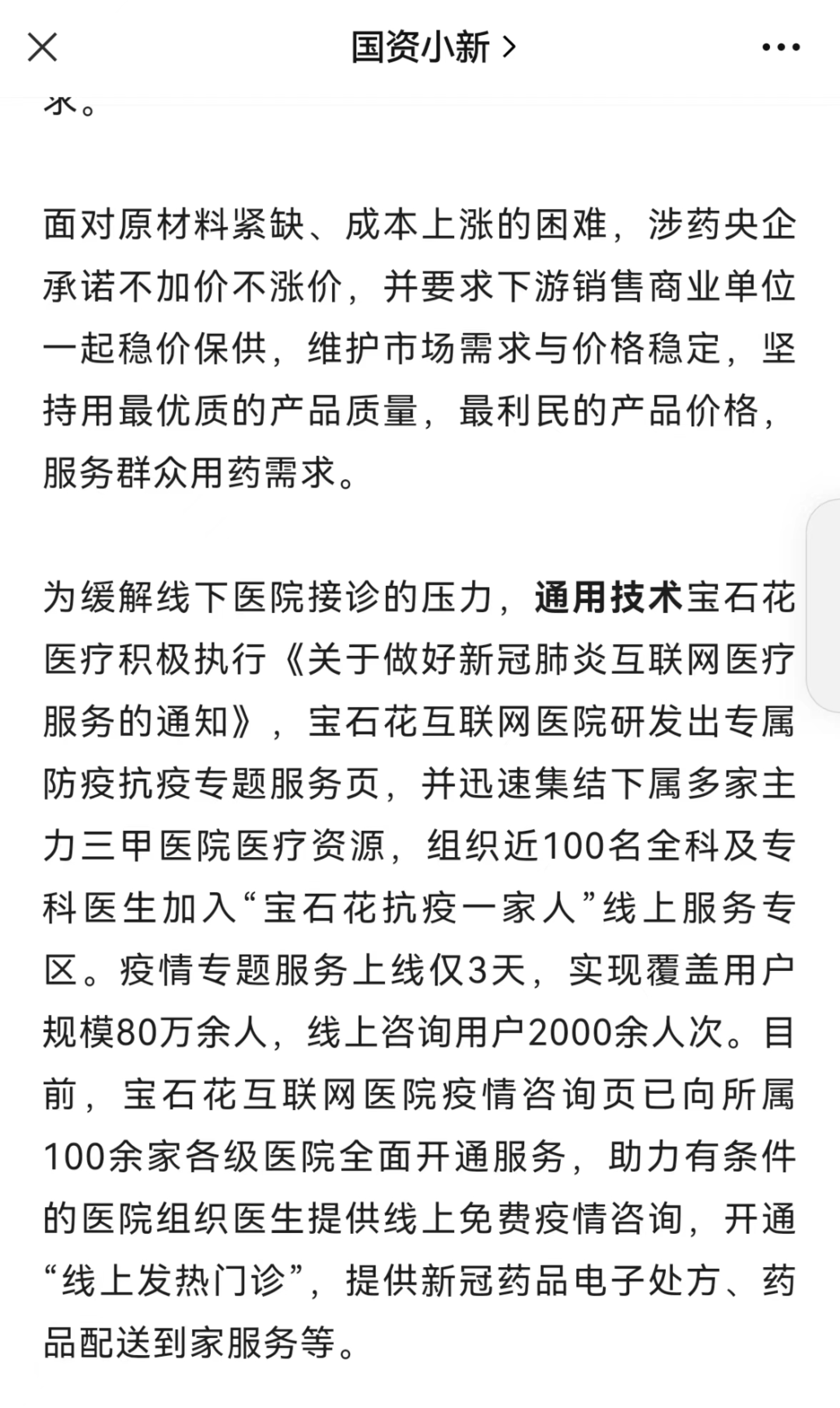 此前,寶石花醫(yī)療互聯(lián)網(wǎng)診療救治新冠肺炎感染患者的情況還得到了國務(wù)院國資委的廣泛關(guān)注。國資委網(wǎng)站和國資小新微信公眾號都做了重點(diǎn)報道。