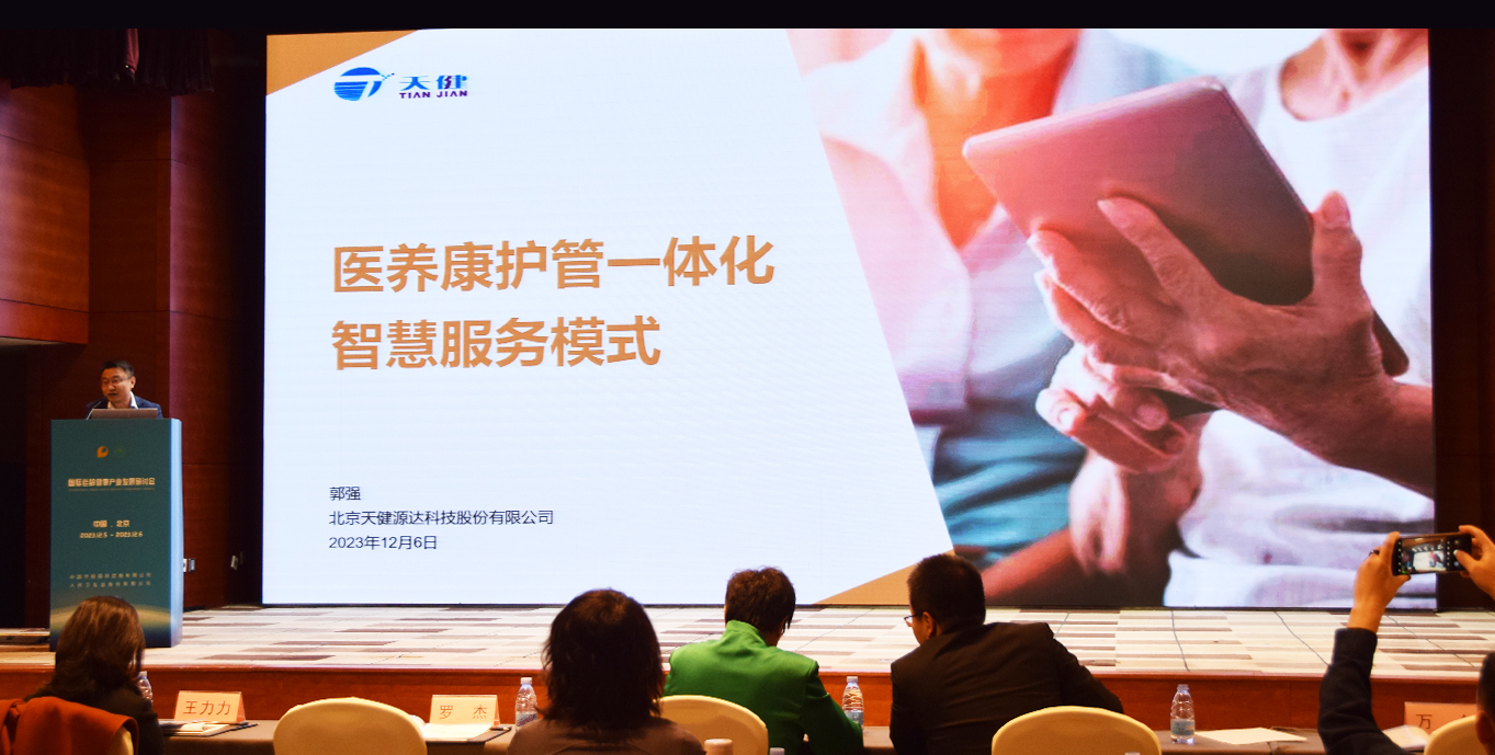 12月6日,由保利集團(tuán)中國輕工集團(tuán)有限公司聯(lián)合人民衛(wèi)生出版社有限公司共同組織舉辦的“國際老齡健康產(chǎn)業(yè)發(fā)展研討會”在北京召開。會上,國家衛(wèi)生健康委老齡健康司、全國老齡工作委員會相關(guān)領(lǐng)導(dǎo)出席并致辭,來自中國人民大學(xué)、南海健康產(chǎn)業(yè)研究院等國內(nèi)外知名養(yǎng)老專業(yè)進(jìn)行了主題演講,天健作為智慧康養(yǎng)行業(yè)代表企業(yè),進(jìn)行了“構(gòu)建醫(yī)養(yǎng)康護(hù)管一體化智慧服務(wù)模式”為主題的案例分享。